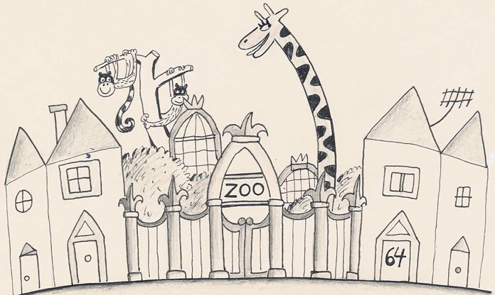An early drawing of 64 Zoo Lane. Note that the two monkeys seen in this image are early prototypes of Giggles and Tickles who have different designs in the final version of the series.