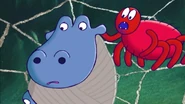 Dennis, Tickles and Giggles, and the Snip Snip Bird are very helpful in helping her during her fears in other locations. For Dennis, he became eligible of bringing her across the desert, especially when it comes to the intense heat. Tickles and Giggles are notable of rescuing her from a hungry spider and in spite of scaring away the spider, the monkeys even showed support in saving Henrietta who was caught in a spider web. Additionally, the Snip Snip Bird also shows a kind personality to give her a beautiful look so the other hippos wouldn't taunt her, by cutting her hair and making her into a princess. When Henrietta returned, the other hippos are impressed by her beautiful look where Henrietta shared her stories about her adventures when she was away from her home.