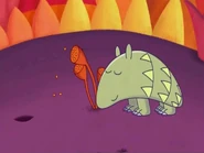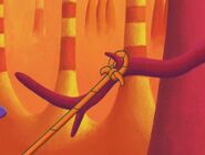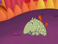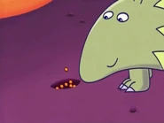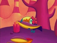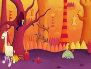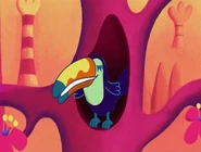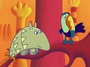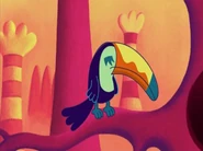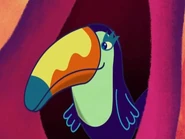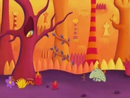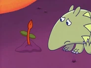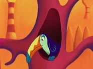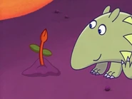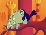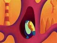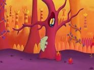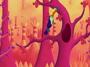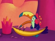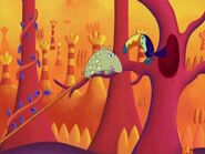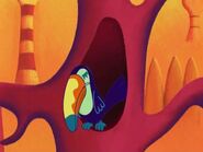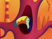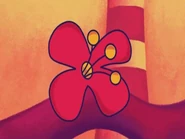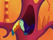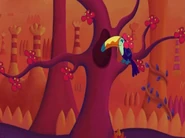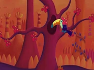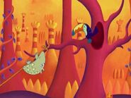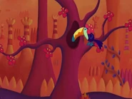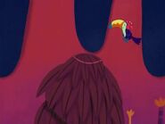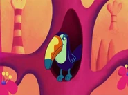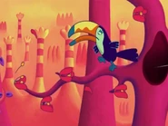 The next day, Tallulah almost did the same thing from yesterday. Unfortunately, a strong wind blows away all the flowers from her tree. Tallulah is very sad, saying the loss of a red flower causes bad luck. She refuses to leave her nest, so the other animals have some other flowers for good luck. Tallulah doesn't like the purple, yellow, and orange ones. She decides to have a red one instead.