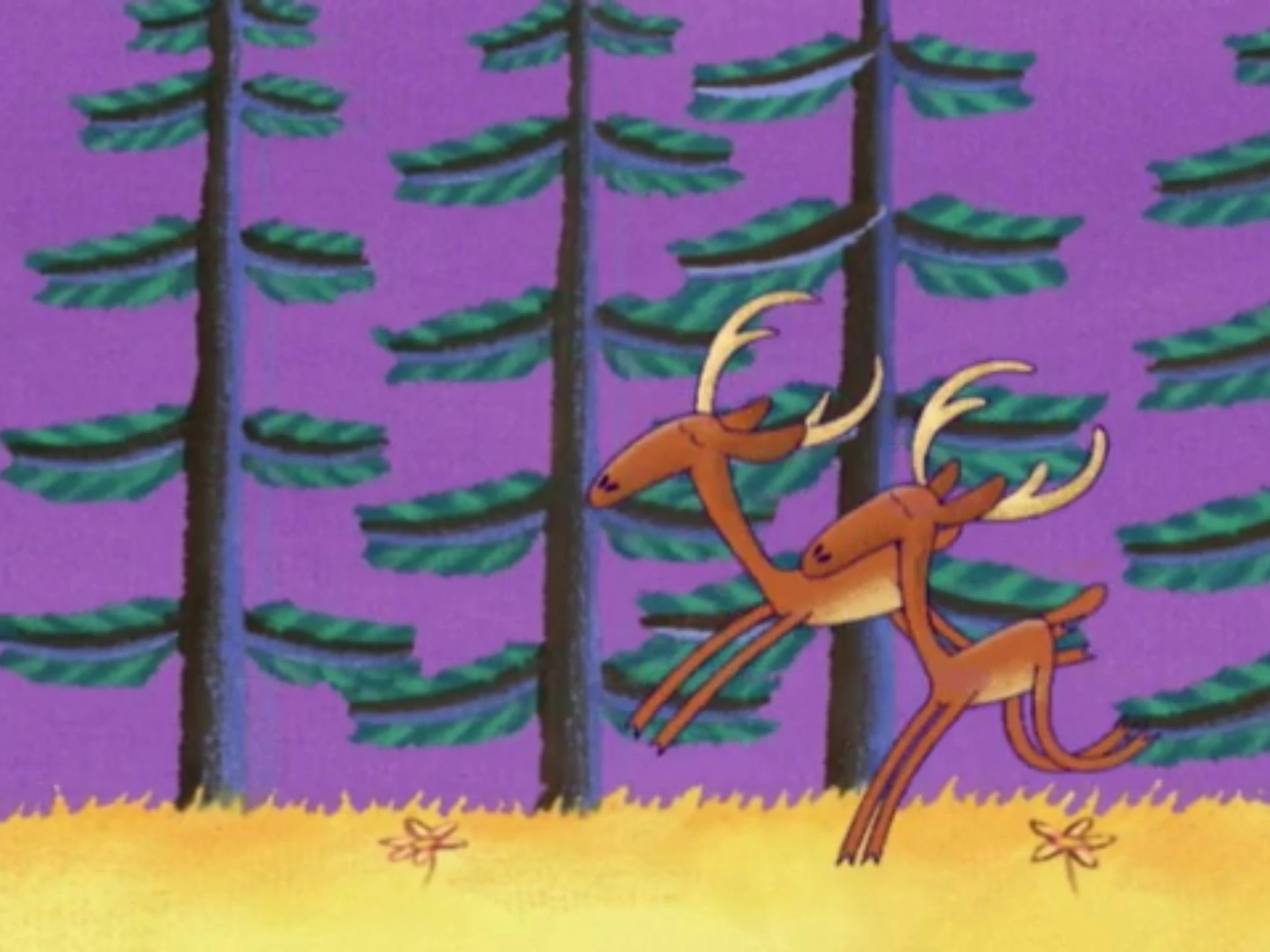 Two white-tailed deer bucks are seen prancing in the North American forest and meadow. Melanie tries to dance like one of them, but nothing ever happened.